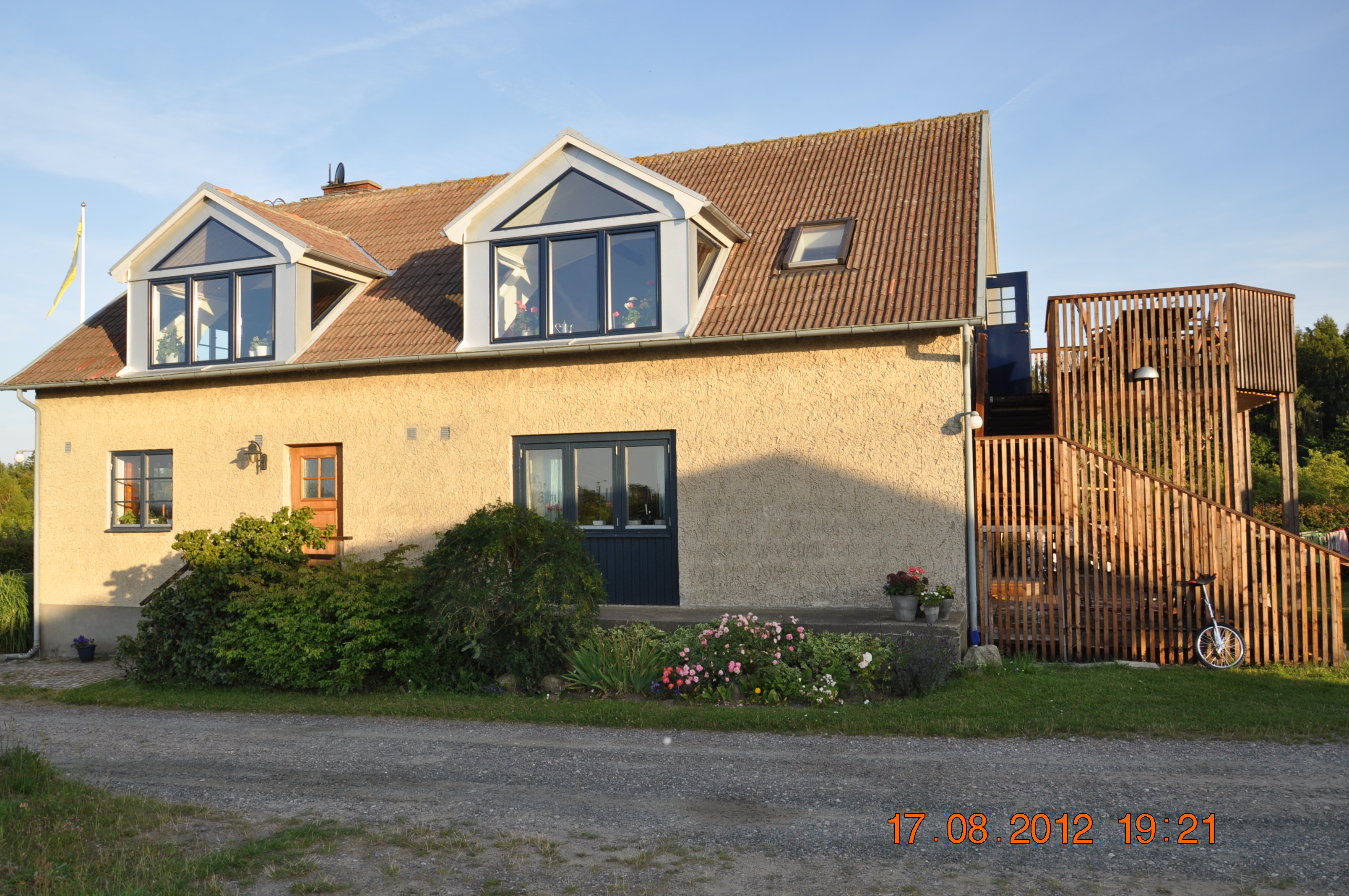 Huset ligger på höjden ovanför Viks fiskläge i en fruktodling som inte besprutas. Lägenheten är inredd i det gamla fruktlagret på ovanvåningen och blev klar i juni 2011. Vi hyr ut den veckovis under högsäsong med lördag som bytesdag. Resten av året går det bra att hyra den per dygn eller längre. Vi som bor här heter Git och Leif Carlsson.