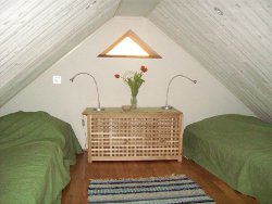 Sovloft med två resårsängar utan ben. Nås via trappstege som kan fällas ut. Portabelt kylaggregat finns. Grind.