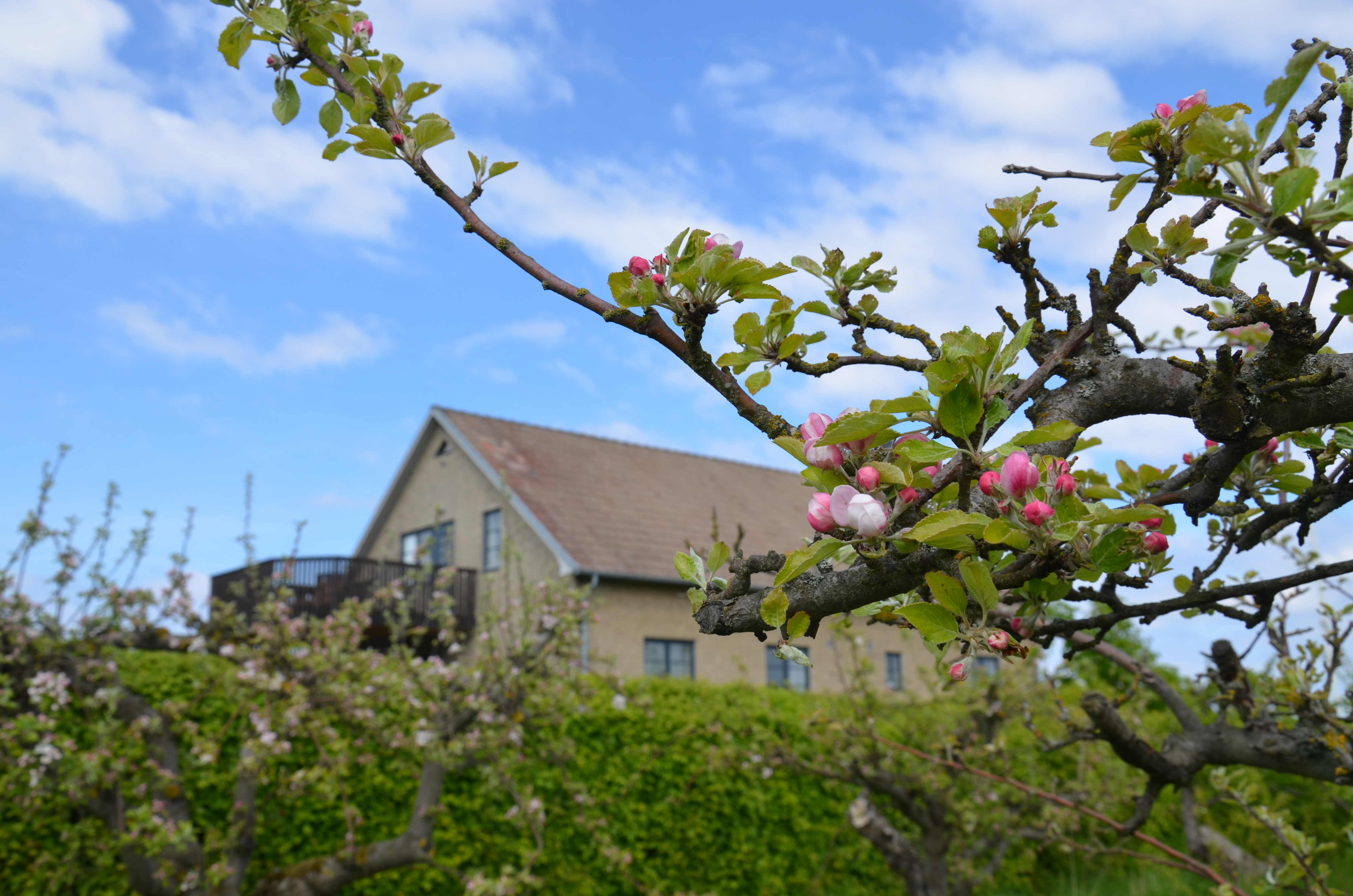 I fruktodlingen bor också våra höns i sitt portabla hönshus. Förutom att förse oss med ägg håller de också rent från diverse småkryp och ogräs. Av våra äpplen pressar vi egen must.